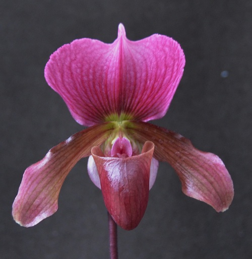 ‘紫旗兜兰’(Paphiopedilum‘Ziqi’)是2006年以引进的红旗兜兰‘CZ-1’(P. charlesworthii‘CZ -1’)为母本、黑光兜兰‘BZ-1’(P. Blacklight ‘BZ-1’)为父本进行杂交,经单种子播种,组培快繁选育而成。多年多点试验结果表明,其遗传性状稳定一致。‘紫旗兜兰’生长势旺盛,播种苗种植28个月的开花植株,平均株高5.3厘米、株幅32.3厘米。叶片狭椭圆形,近革质,叶绿色,叶背浅绿色,平均长16.8厘米、宽3.1厘米。花葶近直立、深紫色有细密绒毛,平均长21.5厘米;花紫红色,平均横径9.7厘米、纵径9.2厘米;中萼片近圆形、两侧向后翻卷,平均长6.2厘米、宽7.0厘米;花瓣匙形,卷曲,褐色,具紫色条纹;唇瓣盔状,紫红色,有紫褐色条纹。开花期12月至翌年3月,单花寿命40-45天。设施栽培条件下抗病性、抗逆性较强。‘紫旗兜兰’属绿叶类兜兰盆花新品种,与对照品种‘黑光兜兰’相比,生长势强,株型大,花朵大而圆整。适合我省设施栽培。