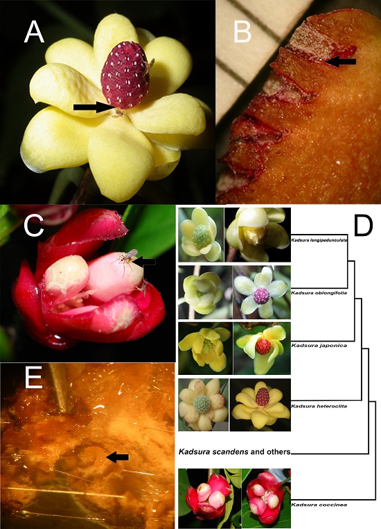 南五味子属的植物大多是在夏天的晚上开花,并且不分泌任何花蜜。当夜幕降临,晚风吹过,一股强烈的花香气味会飘在南五味子植物周围。罗世孝博士通过长期的野外观察发现,一种瘿蚊,又叫松脂瘿蚊(因为幼虫寄生在松树分泌的松脂油中而得名),循着“诱蚊”花香来访问植物的雄花和雌花(图A,C & D)。瘿蚊在访问雄花时产卵于花药内(图B)或特殊的花被(图C),因此身上,特别是尾部会沾上大量的花粉。当瘿蚊在访问雌花时,同样会在此花中产卵,此时瘿蚊身上的花粉会沾到湿的柱头上,完成为植物授粉的过程。瘿蚊的卵会在3-5个小时之内孵化成幼虫(图E),由于幼虫具有咀嚼式口器,因此会咀嚼肥厚的花部结构表面,此时受伤的花会立即分泌 “防御”粘液(图E),以期驱赶这些“害虫”。杨子银博士通过研究发现,这种分泌物的主要成份是石竹烯,花香气味的主要成分是a-蒎烯,两者都是松脂油的主要成份,这个结果很好的解析了松脂瘿蚊能在南五味子花内成长发育的原因。但有一点非常特殊的是,南五味子的松脂瘿蚊是通过自己 “挖掘”而让花部结构分泌松脂油,并且能以这种“防御”分泌为食物,这与前人的研究,寄生在松树上的瘿蚊是利用甲虫伤害松树产生的松脂油产卵和发育完全不同。瘿蚊的幼虫在花内1-2天就发育成老熟幼虫,并且随花部结构一起掉落到地上结茧,第二年花期再飞出开始自己的新一轮生活史,并且为植物传粉。因此,南五味子植物与传粉松脂瘿蚊之间形成了互利共生传粉机制。