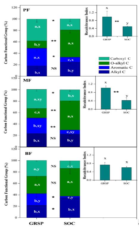 中科院华南植物园博士生张静在导师唐旭利研究员指导下,选择南亚热带演替系列的三种森林,包括演替初期的马尾松林(PF),演替过渡阶段的针阔叶混交林(MF)和演替顶级阶段的季风常绿阔叶林(BF)作为研究对象,运用核磁共振技术测定了GRSP和SOC中C的化学结构,探究了GRSP与SOC的关系。研究结果表明,在南亚热带森林地区表层0-10 cm土壤中,GRSP的平均含量为(3.94±1.09) mg cm-3,占土壤有机碳的(3.38±1.15)%。核磁共振分析结果发现,GRSP以芳香碳(~30%)和羧基碳(~40%)为主,而SOC以烷基碳(~30%)和烷氧碳(~50%)为主。GRSP的难分解指数(RI=(羧基碳+芳香碳)/(烷氧碳+羧基碳))比SOC的难分解指数在PF,MF和BF中分别高了(98.6±18.9)%, (145.5±10.9)% and (20.7±0.3)%。本研究表明,在南亚热带森林中,尤其是演替初期的马尾松林和演替过渡阶段的混交林中,GRSP中难分解的碳组分可能促进了土壤有机碳中难分解碳的固持。