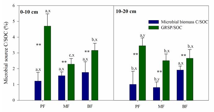 图1 球囊霉素相关蛋白与微生物生物量碳对土壤有机碳贡献的比较