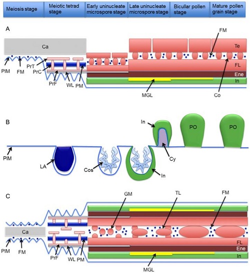 花粉是种子植物的雄配子体,在花药的发育过程中由花粉母细胞经过减数分裂产生、发育而成。花粉的形态学特征为植物分类、系统演化研究提供非常重要的微观形态学资料,也为探讨古植被、古气候和古地理等提供重要参考。在被子植物花粉演化历程中,花粉分散单位的演化趋势为由单粒到四合花粉再到多合花粉。目前,单花粉——四合花粉演化方面的分子机制尚不清楚。
