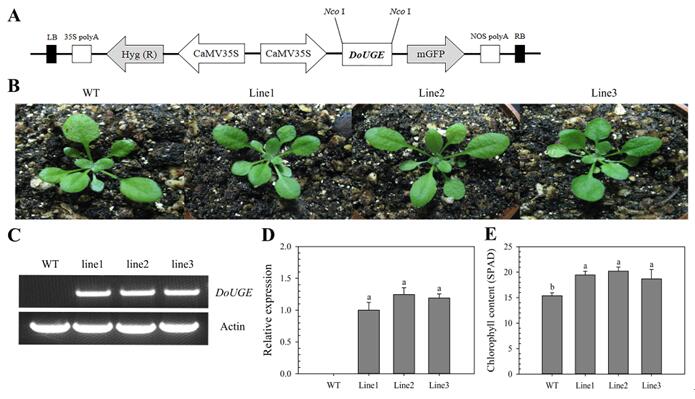 为了揭示铁皮石斛水溶性多糖积累调控的分子机制。华南植物园生物技术育种研究组俞振明博士在段俊研究员的指导下,对参与铁皮石斛水溶性多糖合成过程中的关键酶(UDP-葡萄糖4-差向异构酶,UGE,EC 5.1.3.2)基因进行了克隆和功能分析。研究发现,该基因定位于细胞质中,其转录水平与茎中水溶性多糖含量呈现显著正相关(R2 = 0.94,p < 0.01),并在其上游启动子区域发现了HSE、MBS、TC-rich repeats和CCAAT-box等多个响应逆境胁迫的顺式作用元件。构建了pCAMBIA1302-DoUGE超表达载体,通过转化拟南芥进行转基因功能验证的结果表明,转基因植株的水溶性多糖含量,以及水溶性多糖中的葡萄糖、半乳糖含量大幅度增加,在盐胁迫和干旱胁迫条件下,转基因植株的生长状况优于野生型。