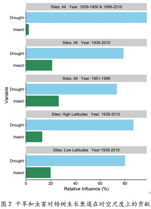 中科院华南植物园生态及环境科学研究中心黄建国研究员指导研究生运用线性和非线性混合模型及小波分析等手段,对上千公里纬度梯度(52oN-58oN)杨树群落径向生长对气候变化响应关系开展系统研究,开创性的量化了1930-2010年间虫害和干旱对寒带林杨树生长衰退的贡献,发现:在发生持续干旱的时段,干旱和虫害的贡献率分别为98%和2%,而在未曾发生持续干旱的时段,干旱和虫害的贡献率分别为73%和27%(图1和图2)。该研究准确揭示了气候变暖诱导的干旱是近几十年来北半球森林衰退和死亡的主要贡献者,因此预期通过准确预报干旱发生的频度可有效管理北半球正在衰的森林生态系统以及实现林业可持续发展。
