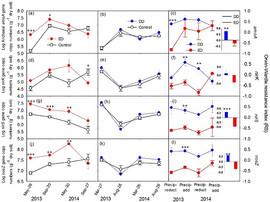 图2. 季节降水格局变化下,土壤硝化、反硝化功能基因丰度及其耐力指数(resistance index)的变化。Archaeal amoA: 氨氧化古菌的氨单加氧酶基因;nirK, nirS: 亚硝酸还原酶基因;nosZ:氧化亚氮还原酶基因;ED: 延长干季、湿季更湿处理;DD: 干季更干、湿季更湿处理;Precip-reduct: 减少降水;Precip-add: 增加降水。