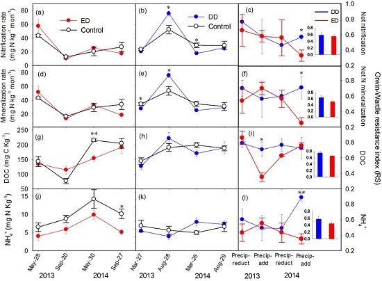 图1. 季节降水格局变化下,土壤氮转化速率、可溶性有机碳(DOC)、铵态氮含量以其耐力指数(resistance index)的变化。ED: 延长干季、湿季更湿处理;DD: 干季更干、湿季更湿处理;Precip-reduct: 减少降水;Precip-add: 增加降水。