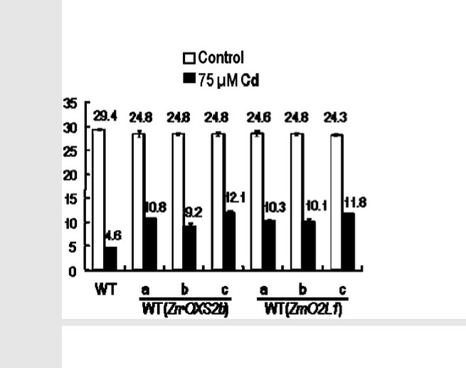 结果表明,该些基因的表达都受到镉胁迫的诱导,而且当它们在拟南芥中高表达时,可以特异地增强拟南芥对镉的耐受性,从而提高拟南芥在逆境下的生长能力(图1)。显然,ZmOXS2b与ZmO2L1的应用将能大大提高作物对重金属胁迫的耐受性,在抗逆作物分子设计育种上有着巨大的价值。相关专利于2019年7月获得了国家知识产权局的授权。