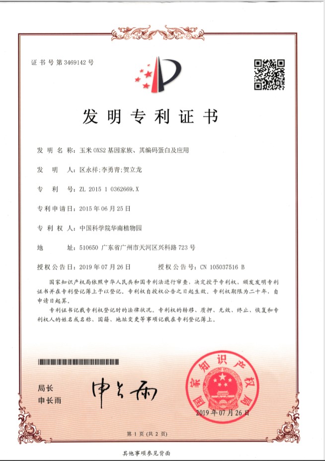 华南植物园“玉米OXS2基因家族、其编码蛋白及应用”获发明专利