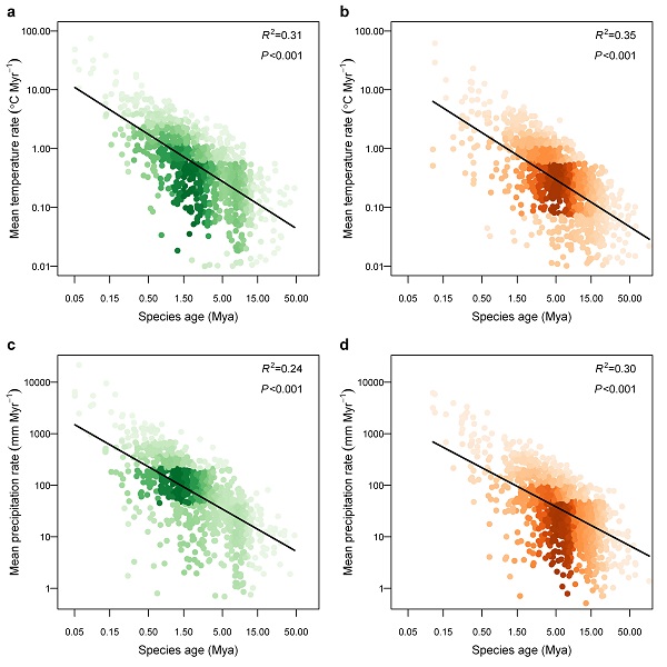 中国科学院华南植物园生态及环境科学研究中心全球变化与植物功能性状研究组刘慧副研究员(PI:叶清研究员),与美国亚利桑那大学生态与演化系John Wiens教授合作,构建了包括19个植物类群和17个动物类群共2087个物种的全球分布和系统发育数据库,通过计算6个气候生态位(包括3个水分生态位和3个温度生态位)的演化速率,运用多种模型检验了气候生态位演化模式的一系列假说。研究发现,在所有的假设检验中植物和动物类群都表现出高度相似性:如两类生物的气候生态位演化速率(climatic niche evolution rate, CNER)都较低;物种形成时间越短CNER越高(图1);物种基于最湿季降水量的CNER 显著高于基于最干季降水量的CNER等一系列结论。从而解释了动、植物类群在全球尺度具有相似的丰富度中心、地理分布格局和生物多样性热点的内在机理。