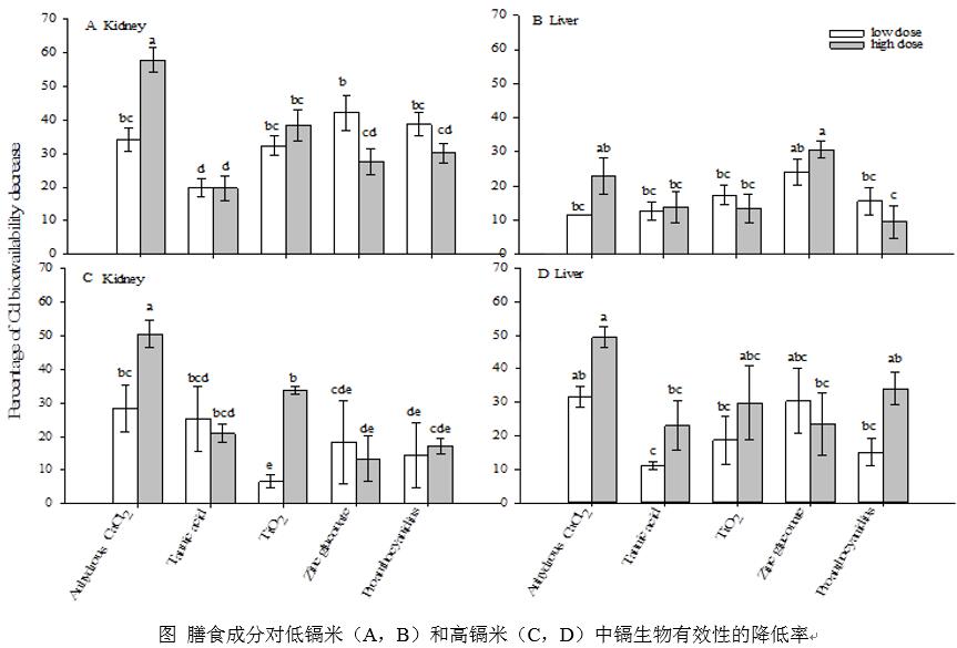 华南植物园生态中心在读研究生孙硕在导师庄萍副研究员的指导下,建立体外胃肠道模型分析39种膳食成分对稻米中Cd生物可给性的影响,进而又建立小鼠动物模型研究了降低效果最有效的组分对稻米中Cd生物可利用性的调控。结果表明,多种组分均能显著降低Cd在肠道的溶解度,降低率达10-98%。单宁酸、二氧化钛、葡萄糖酸锌、氯化钙和原花青素对降低稻米中镉的生物可给性最有效,其降低率分别达到93-97%、54-61%、32-49%、24-32%和11-14%。添加膳食成分后,小鼠肾脏和肝脏中镉的相对生物有效性的降低率分别为20-58%和10-31%。