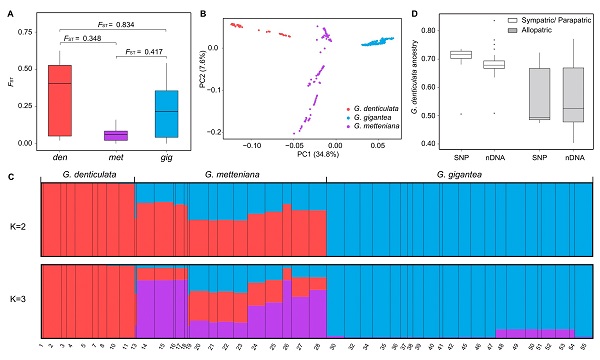 图. 小黑桫椤(G. metteniana)与其亲本大叶黑桫椤(G. gigantea)和粗齿桫椤(G. denticulata)的遗传分化