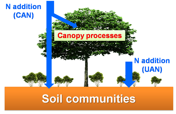 氮沉降对森林生态系统群落组成具有显著影响,而传统模拟氮沉降研究一般基于林下直接施氮,忽略了林冠过程的截留作用。考虑到林冠可以截留和利用相当一部分氮素(例如叶片可以直接吸收利用氮素),从而改变植物对土壤食物网的资源输入,将对直接利用凋落物和根系分泌物的土壤生物群落产生影响。土壤生物群落是陆地生态系统重要的分解者,参与维持森林生态系统的结构和功能。因此,在全球氮沉降增加的背景下,研究林冠过程如何影响土壤生物群落组成具有重要的意义。