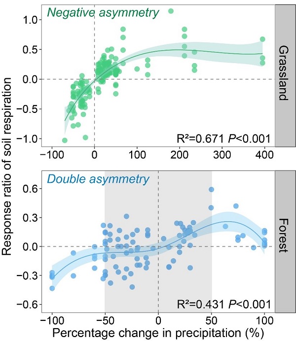 中科院华南植物园生态中心博士后杜悦在合作导师闫俊华和王应平研究员的共同指导下,以全球248篇降水量变化控制实验研究论文的观测数据为基础,分析了草地和森林两类生态系统土壤呼吸对降水量变化的响应。发现草地和森林两类生态系统土壤呼吸对降水量变化的响应表现为不同的非线性(图1)。在草地生态系统中,土壤呼吸的响应为负不对称性(negative asymmetry, 对降水量减少的敏感性更大)。而在森林生态系统中,土壤呼吸的响应则随着降水量变化的强度而呈现不同模式,在中强度降水量变化条件下表现为正不对称性(positive asymmetry, 对降水量增加的敏感性更大),而在极端降水量变化条件下为负不对称性。该结果将为预测土壤碳动态对降水量变化的响应和反馈提供可靠依据。同时,草地和森林两类生态系统土壤呼吸对极端降水量变化的响应表现为一致的负不对称性,这预示着在未来降水量变异增大(极端降水事件频发)的情形下,土壤碳排放将显著降低。