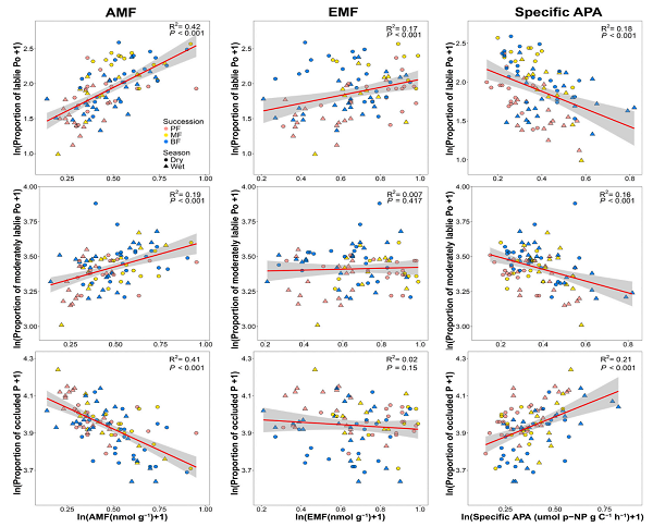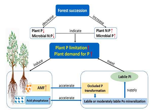 中科院华南植物园生态中心柳杨博士在温达志研究员指导下,基于前期对全球626个未受施肥等人工干预的自然土壤分析的发现:固相不稳定无机磷(Pi)和闭蓄态(occluded P)向中活性、活性有机磷(Po)转化,而非传统认知的可溶性磷在土壤磷供给中的核心作用(Hou et al., Global Biogeochemical Cycles, 2016),但作用机制并不清楚。为此,科研人员采集了在鼎湖山自然保护区内森林演替前期、中期和后期的优势树种叶和根际土壤样本,测定了叶P浓度和根际土壤指标包括微生物生物量磷(MBP)、 P分级提取组分、酸性磷酸酶活性、丛枝菌根真菌(AMF)和外生菌根真菌(EMF)的生物量。研究结果表明:(1)在森林演替早期至后期的过程中植物磷限制增加而微生物磷限制得到缓解;(2)根际土壤闭蓄态P比例的降低与AMF生物量的增加呈负相关,有机磷和中度不稳定磷的增加与AMF生物量的增加呈正相关,但与森林演替过程中酸性磷酸酶活性的增加呈负相关(图1)。该研究提出了南亚热带森林演替过程中植物磷获取机制,即AMF促进闭蓄态P向活性、中活性Po转变,酸性磷酸酶进一步将可水解Po转变成有效P供植物吸收利用(图2)。