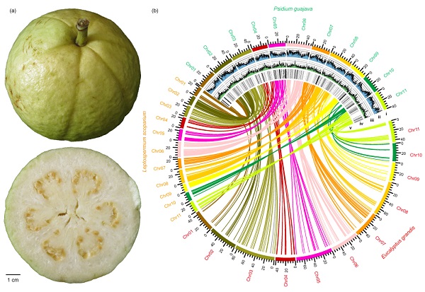 图1. 番石榴果实(a)和三个物种(番石榴、桉树、松红梅)基因组的共线性图(b)。