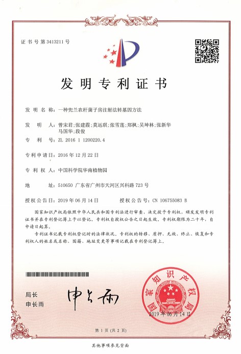 花粉管通道法是由我国科学家周光宇于1979年首先提出和设计的,它是利用植物受粉后所形成的天然花粉管通道,经珠心通道将外源DNA携带进入胚囊,转化受精卵或其前后的生殖细胞。由于此时的转化细胞没有形成细胞壁并正在进行活跃的DNA复制、分离和重组,很容易将外源DNA片段整合进受体基因组中,以达遗传转化的目的,其外源DNA转化的最佳时期也被证明在精卵融合至合子分裂前这一段时期。由于兜兰从受粉至受精一般需要40-50天,如果直接采用花粉携带目的基因会产生降解。曾宋君研究员等科研人员利用子房注射法有效的解决了这个问题。即先对摩帝兜兰的胚胎发育过程进行了显微观察,发现其在受粉后40-45天是受精期,在此时期进行子房注射能获得较高的转化率,最高可达2.54%,而兜兰果实中一般均有数万粒种子。