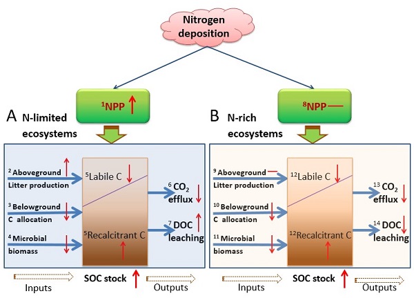 图2. 土壤碳吸存假说的框架模型:氮沉降增加促进 “氮限制”生态系统(A)和 “富氮”生态系统(B)土壤碳吸存。