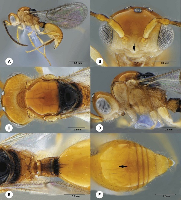 图1. 巨点寄螯细蜂Ismarus areolatus Chen, 2021,雌,正模. 种名根据中胸小盾片密布大的凹点(见图2C)而拟。(图引自Zhang et al. 2021)