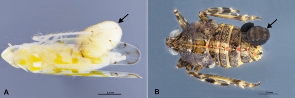 图3. A. 被螯蜂寄生的叶蝉成虫. B. 被螯蜂寄生的瓢蜡蝉若虫. 箭头所示的是螯蜂幼虫. (陈华燕供图)