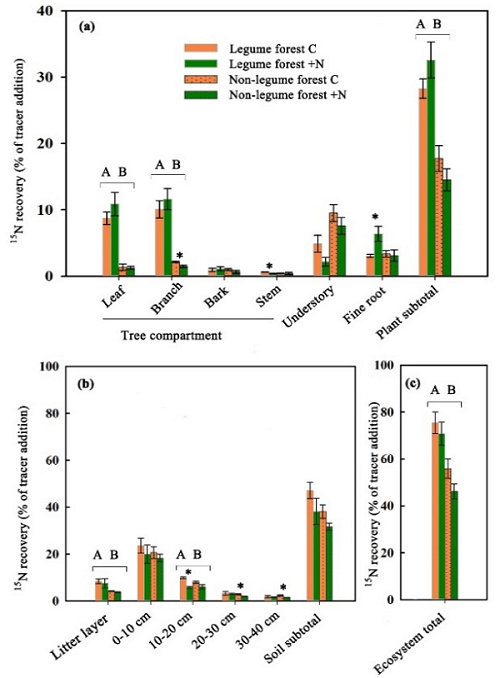 图1. 外源输入氮(大气沉降氮和氮添加)在豆科林和非豆科林中的留存和分配模式