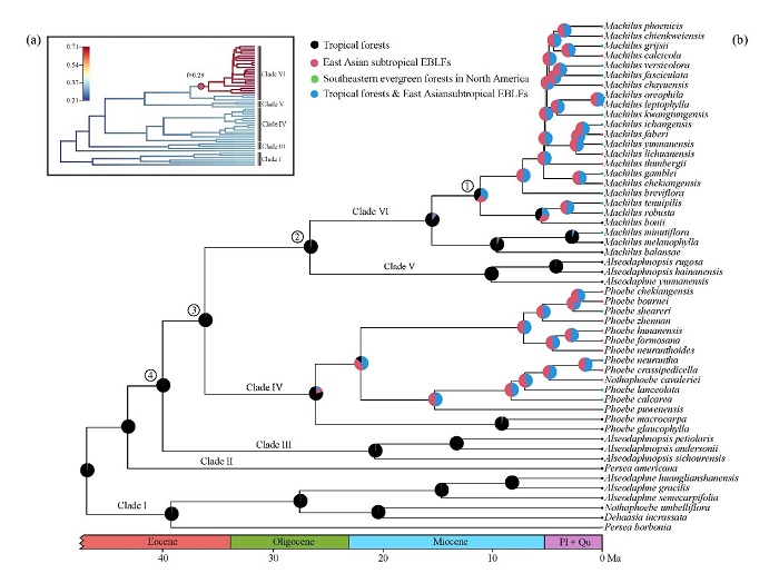 中科院华南植物园分子生态学研究团队对国内樟科鳄梨族进行了系统发育树构建、分化时间分析、祖先状态重建和分化速率分析。结果表明,鳄梨族系统发育树的拓扑结构不受数据分区、质体基因组编码区和非编码区、碱基替换饱和度和比对空缺的影响,并分为6个主要分支;鳄梨族在早中新世从热带进入东亚亚热带常绿阔叶林,鳄梨族的分化速率在晚中新世快速提升。早中新世的降水增加可能促进了鳄梨族分布范围的扩张。晚中新世的季风增强可能导致了东亚亚热带常绿阔叶林的物种聚类和快速分化。