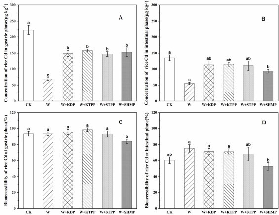 研究人员将原位土壤镉固定化和生物可利用性校正健康风险评估(HRA)相结合,以最大限度地降低大米消费引起的镉暴露风险和评价不确定性。在轻度镉污染农田上单施或配施硅灰石与四种磷酸盐,结果表明,硅灰石和四种不同的磷对水稻籽粒中镉浓度的降低效果相同,但在模拟人体胃肠消化过程中,硅灰石和磷对水稻中镉生物可利用性的影响不一致(53%–71%)。基于米镉生物可利用性的HRA表明,硅灰石施用对稻米镉的暴露风险最低,其次是硅灰石和六偏磷酸钠共同施用。