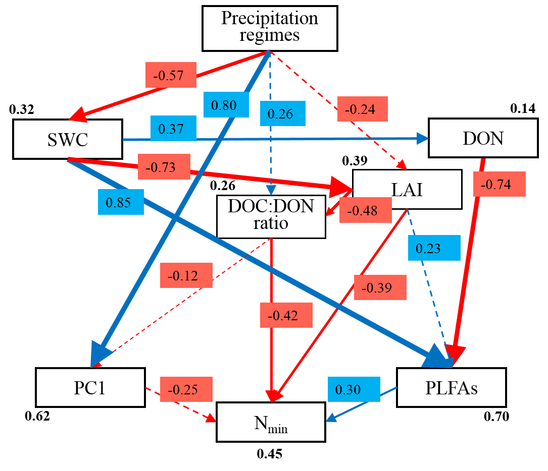 图2 揭示降水变化如何影响土壤氮净矿化的结构方程模型