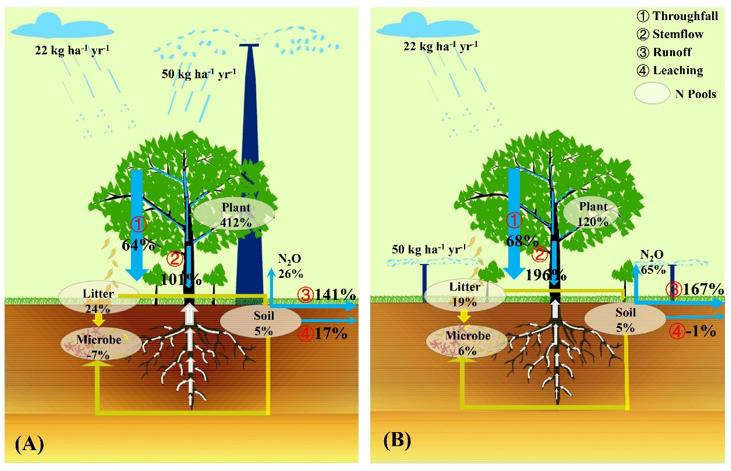 图:林冠(A)和林下(B)氮添加50 kg ha-1 yr-1对南亚热带季风常绿阔叶林氮收支的影响。图中百分比表示相比对照变化的比例,正值表示增加,负值表示降低。