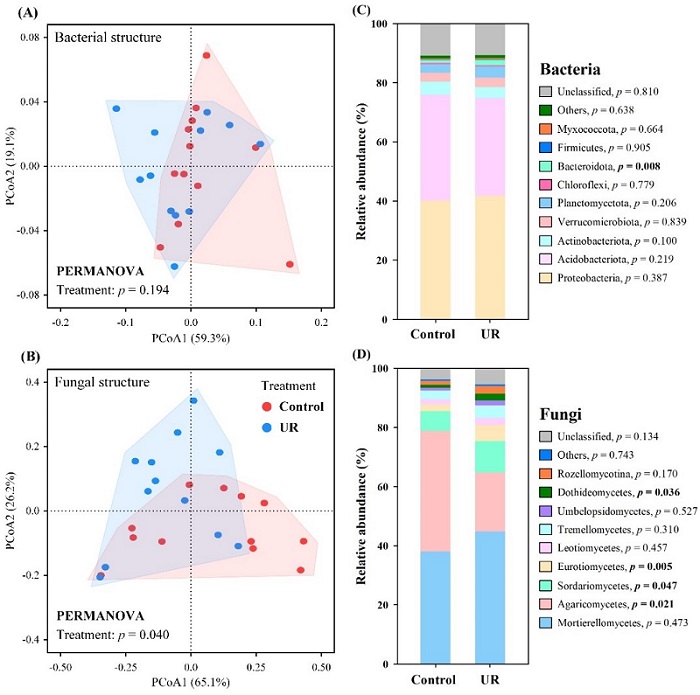 图1 林下植被去除(UR)对土壤细菌和真菌群落结构的影响