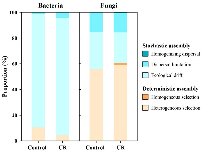 图2 林下植被去除(UR)对土壤细菌和真菌群落组装过程的影响