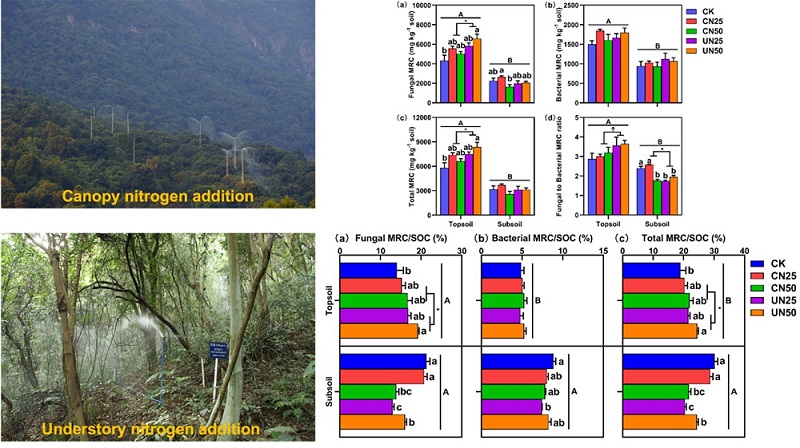 中科院华南植物园恢复生态学任务团队基于林冠和林下氮添加野外控制实验平台,研究了氮添加方式(林冠vs.林下)、氮添加水平(25 kg N ha-1yr-1 vs. 50 kg N ha-1yr-1)和土壤深度(表土 vs. 底土)对微生物残体碳及其对土壤有机碳库贡献的影响。研究发现,土壤微生物残体碳对氮添加方式和水平的响应受土壤深度的调控:1)氮添加提高了表层土壤真菌残体碳和总微生物残体碳的含量及其对土壤有机碳的贡献,但降低了底层土壤真残体碳和总微生物残体碳对土壤有机碳的贡献,不同深度土壤差异性的差异主要受微生物残体来源(微生物生物量)的影响;2)林下氮添加对微生物残体碳积累的影响要显著高于林冠氮添加,表明森林冠层可以缓冲外源氮输入对土壤微生物残体的影响。该研究从土壤微生物的角度进一步证实了森林冠层在缓解大气氮沉降对热带森林土壤碳循环过程中的作用,并指出了未来对氮沉降的研究中亟需考虑不同土壤深度的潜在影响。