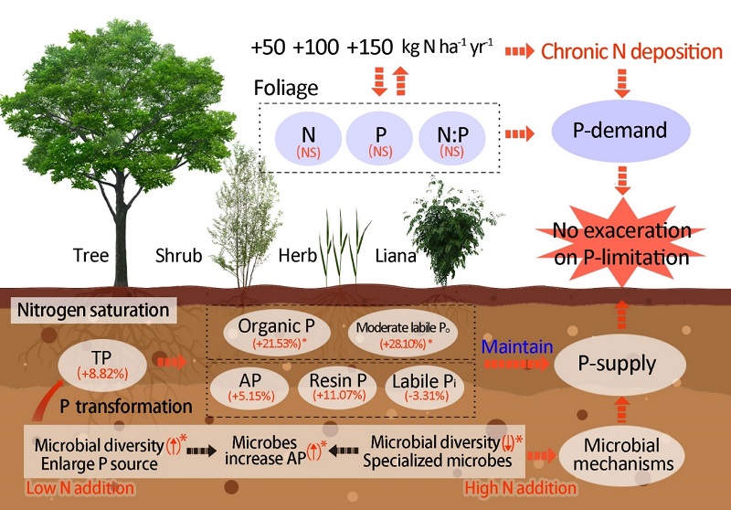 中国科学院华南植物园生态中心博士生余光灿在闫俊华研究员、王应平研究员和郑棉海副研究员的指导下,依托鼎湖山长期氮添加试验平台,选取了9种主要植物包含4类生长型(乔木、灌木、草本和藤本)为研究对象,通过分析植物叶片的养分浓度、根际土和矿质土磷组分及其他理化性质的变化,评估了氮添加对南亚热森林主要物种磷需求和土壤磷供应的影响。研究发现,氮沉降不会加剧南亚热森林磷限制,不同氮添加速率均没有显著改变4类生长型植物叶片的氮、磷浓度以及氮磷比。3个氮添加处理也没有减少根际土总磷和有效磷的含量。这可能是因为该森林植物适应富氮的土壤后,没有因氮添加而增加植物从土壤中吸收氮,植物为了保持体内稳定的化学计量比,因此也不需要吸收更多的磷。此外,不同氮添加速率通过改变根际土微生物的群落结构改变土壤磷的转化:低氮添加速率显著提高了土壤微生物的Shannon-Weiner指数和革兰氏阳性菌与阴性菌之比,由于微生物群落包含更多的k策略微生物,因此能通过促进对难分解有机物的利用而增加了磷的来源;高氮添加速率显著降低了土壤微生物的Shannon-Weiner指数,经过选择压力后,土壤中保留下来的微生物既能够耐受不利环境,又能保持高效地对磷的利用。