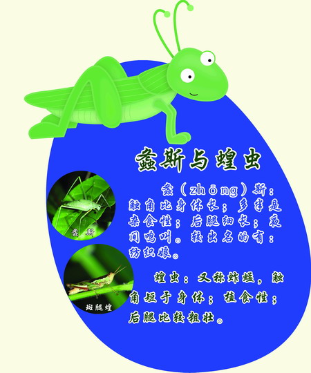 蝗虫:又称蚱蜢,触角短于身体;植食性;后腿比较粗壮。两者都靠前翅摩擦发声。