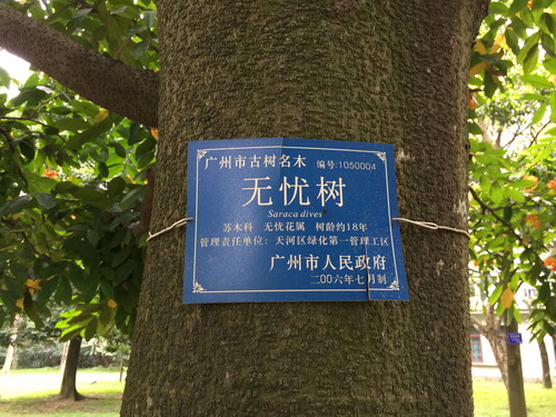 华南植物园名人手植树区内的几株无忧树都是名人亲手种植。其中一株是由柬埔寨前国王西哈努克及夫人在1986年3月亲手种下,当时饱尝战乱之苦的西哈努克风趣地说:“希望我们国家解放以后,也像你们一样过上无忧无虑的生活”,如今他种下的无忧树已花繁叶茂,他的国民也逐渐过上了安康的生活。这株已有29年树龄的无忧树被广州市政府定为“古树名木”加以保护。