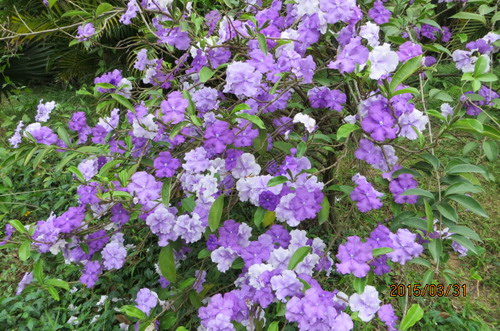 鸳鸯茉莉(Brunfelsia acuminata Benth.)为茄科多年生常绿灌木,又称五色茉莉、二色茉莉、番茉莉。株高约1米,单叶互生,椭圆形,叶柄极短;花单生或数朵聚合成聚伞花序,花朵从破蕾到盛开之初,颜色为深紫色,随着时间的推移,花冠的深紫色逐步变淡,最后成为纯白,鸳鸯茉莉的每一朵花都会经历这种变化过程,由于花朵开放时间不一,先开的已变白,后开者仍为深紫,二色花齐放枝头,故有“鸳鸯茉莉”之称。其英文名意为“昨天、今天、明天”,也形象地描绘出花色的特殊变化。