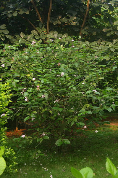 红花蕊木隶属夹竹桃科(Apocynaceae)蕊木属灌木,主要分布于印度、菲律宾、马来西亚等地。其叶纸质,叶面深绿色,具光泽,叶背淡绿色;聚伞花序顶生,花冠粉红色,花冠筒细长,花冠裂片长圆形。