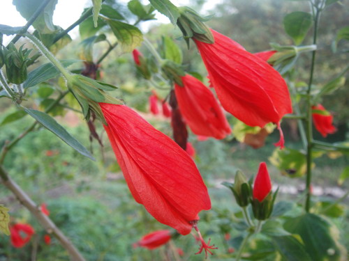 垂花悬铃花(Malvaviscus arboreus var. penduliflorus (DC.) Schery),别名南美朱槿、灯笼扶桑、卷瓣朱槿,锦葵科(Malvaceae)悬铃花属常绿小灌木,外型略似朱槿,但叶片较为狭长浓绿;高30-60cm,叶片互生,卵形或卵状矩圆形,单叶,有时浅裂,叶形变化较多,叶面具星状毛。花红色,花通常单生于上部叶腋处,下垂,花冠呈漏斗形,五枚花瓣略左旋作卷筒状,仅上部略微展开,雌雄蕊细长突出花瓣外,看似永远含苞待放。