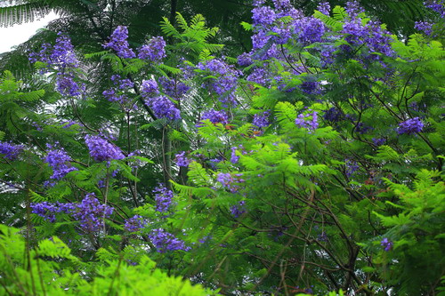 蓝紫色朵朵小花簇傲立枝头,羽状叶片轻盈摇曳。此情此景颇有几分‘紫玉’妆成一树高、万尾羽毛轻飘飘之意境。木本植物中很少开蓝花,高大乔木中开蓝花的就更少,因此蓝花楹更显珍贵。蓝花楹在世界各地广受欢迎,澳大利亚街道两旁种植许多蓝花楹;南非行政首都比勒陀利亚有“蓝花楹之城”的美誉。