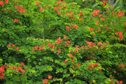 橙花羊蹄甲抗风耐旱,花期长,花姿花色美妍悦目,为良好的铺地性观花观叶植物。