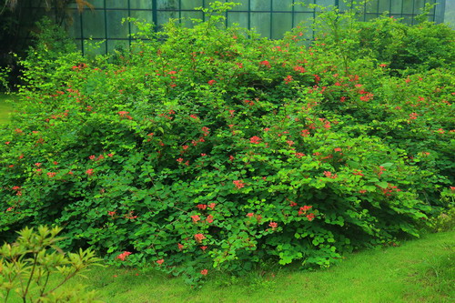 橙花羊蹄甲(Bauhinia galpinii N. E. Brown),为豆科(Fabaceae)羊蹄甲属常绿藤状灌木,又名南非羊蹄甲、嘉氏羊蹄甲。树形低矮,株高仅50-150cm,枝条细软,枝极平整,向四周匍匐伸展,冠幅常大于高度。叶革质互生,双肾蝴蝶型,形状如羊蹄,故名。花大量,伞房或短总状花序顶生或腋生于枝梢末端,花瓣5瓣,橙红色,热情洋溢,花期5-10月。荚果扁平,初为绿色,成熟时为褐色,且木质化,常宿存。
