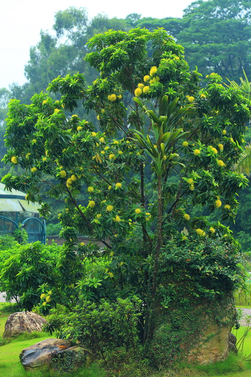 一进入华南植物园温室群景区,就能看到一株满树开黄色花的植物,它几乎全年有花,远远望去,满树金黄格外引人注目。它就是我们今天要介绍的主角,来自澳大利亚的特有植物——金蒲桃。