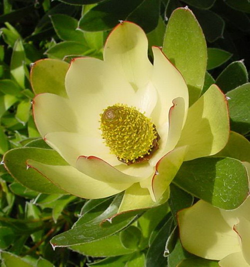 帝王花家族系列中的木百合跟我们所熟悉的百合花毫无血缘关系,这只是它当年踏入香港领土时的叫法。实际上,它是山龙眼科木百合属(Leucadendron)植物的统称。由于俏丽奇特的外形与郁金香有些相似,所以也被人们称为非洲郁金香。盛开中的木百合,亭亭玉立、亦花亦叶,其花形秀丽、清纯,有亮黄、紫红及绿等多个花色。由于花形奇特,深受市民特别是花艺爱好者的喜爱。它的观赏点在于它簇生的叶片和多色的苞片。因此,在众多的高端的花卉花艺展示中总少不了其玲珑多变的身影。