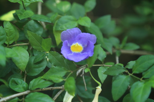 每年的夏秋季,苏铁园入口的凉亭上,大花老鸦嘴成串大朵浅蓝色的花儿垂挂而下,编织成美丽的藤帘,如梦似幻。大花老鸦嘴(Thunbergia grandiflora Roxb.),又名大邓伯花、大花山牵牛、山牵牛,爵床科(Acanthaceae)粗壮木质常绿大藤本,原产孟加拉、泰国、印度、中国,广植于热带和亚热带地区。