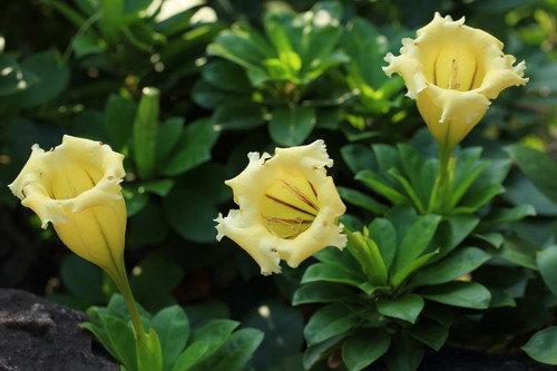 今天的广州清晨,有了点初秋的味道,凉风习习甚是舒爽。到了午后,气温又上升至30度以上,进入炎夏。那么,这秋天的脚步到底离广州还有多远?无论凉爽还是炎热,花儿们始终淡定一如寻常,用怒放来表现自己。如今漫步在沙漠植物室室外小路,有一种高调的大喇叭花正开得欢快热烈,让人无法忽视它的存在,它就是金杯花。