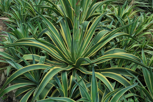 金边礼美龙舌兰(Agave desmettiana ‘Variegata’),龙舌兰科。原产美洲热带地区,为多年生常绿草本。叶莲座状,肥厚饱满,灰绿色,叶缘有金色条纹。