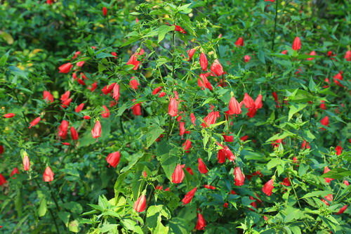 垂花悬铃花(Malvaviscus penduliflorus Candolle),锦葵科(Malvaceae)常绿灌木,高可达2米。叶卵形至近圆形,全缘或浅裂。花单生于叶腋,花枝下垂;花冠漏斗形,仅上部略微展开,鲜红色。在热带地区,几乎全年开花,盛花期在9-12月。