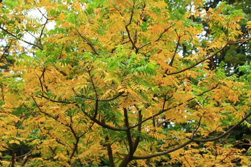 而加椰芒(Spondias cythera)的树叶已经变黄了,满树金黄,在阳光的照耀下异常璀璨夺目。