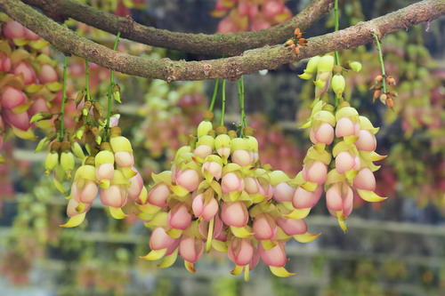除了最常见的白色禾雀花,华南植物园内还有罕见的粉红色、深紫色及紫白相间的禾雀花。这些“彩色”禾雀花,花色艳丽夺目,除“头部”为绿色略带锈色绒毛外,其它部位均是紫色或粉红色和白色相间,形态奇特,小巧玲珑,可爱又好看。