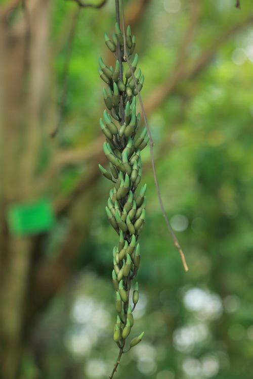 翡翠葛(Strongylodon macrobotrys A. Gray)又名碧玉藤,豆科碧玉藤属木质藤本,来自菲律宾。其花朵沿着花梗呈平展状生长,每一串花有数十朵,每一朵盛开的花像是一只翡翠雕琢而成的小鸟。花碧玉色透蓝色光泽,在阳光的照耀下,如翡翠般晶莹剔透,含苞的酷似翡翠象牙,盛开的如同翡翠雕琢而成的金刚鹦鹉的喙,弯弯上翘的龙骨瓣甚为张扬。