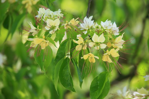 台湾鱼木(Crateva formosensis (Jacobs) B. S. Sun)又叫树头菜、三脚桌,山柑科乔木,高3—15m,3—5月开花,三出复叶,花瓣叶状,白色转黄色,紫红色的花蕊向外伸长,细细长长随风飘舞像鱼儿浮动的触须。花开时花多色艳,聚生枝顶,醒目多彩。鱼木也是端红粉蝶、黑点粉蝶、纹白蝶、淡黄蝶等蝴蝶的食草,试想一下,花开灿烂时蝴蝶纷飞,此景只应梦中有吧。