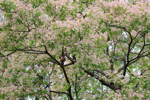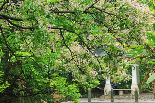 如今步入华南植物园姜园,被各种美丽的姜花迷了双眼的时候,突然会有一种浓烈的味道袭来。顺着味道寻去,远远就能看到两株大树,满树繁花。可偏偏就是这种美丽的花儿,却发出令人难忍的臭味,她的名字叫仪花。